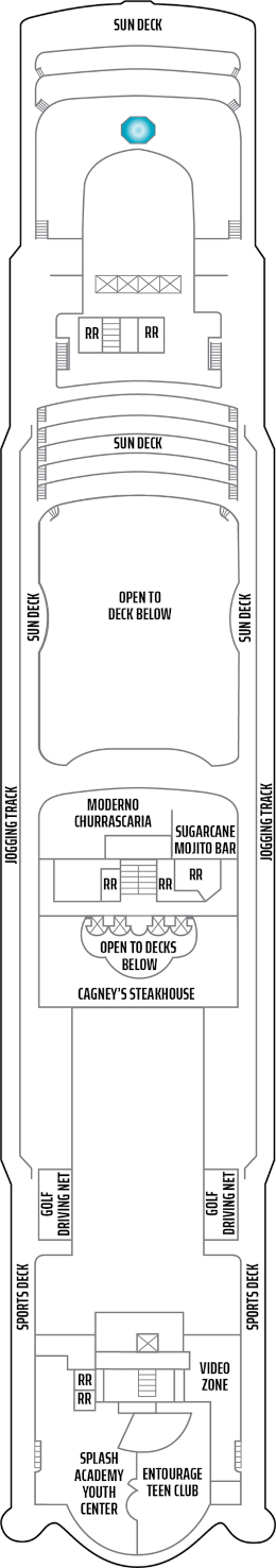 - Deck sports include volleyball, basketball, golf driving range, batting cage, shuffleboard, jogging track